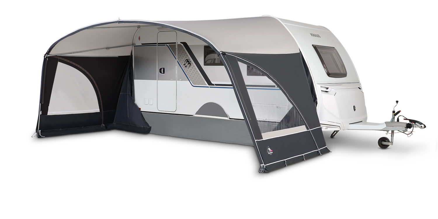 Mit einer Tiefe von 240 cm bietet dieser Sonnendach mit runder Dachform extreme Stabilität. Die seitlichen Apse ermöglichen zusätzlichen Schutz und die vordere Wand ist erweiterbar. Perfekter Sonnenschutz zum Entspannen!